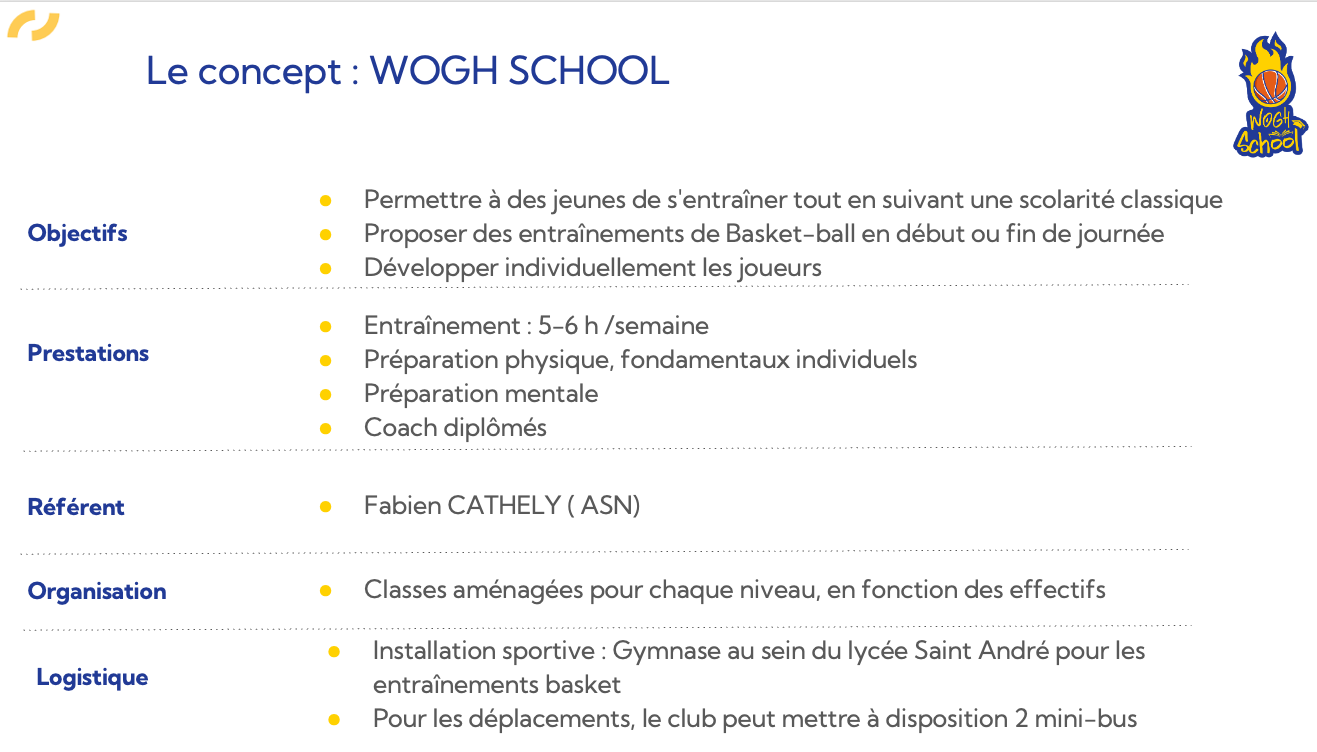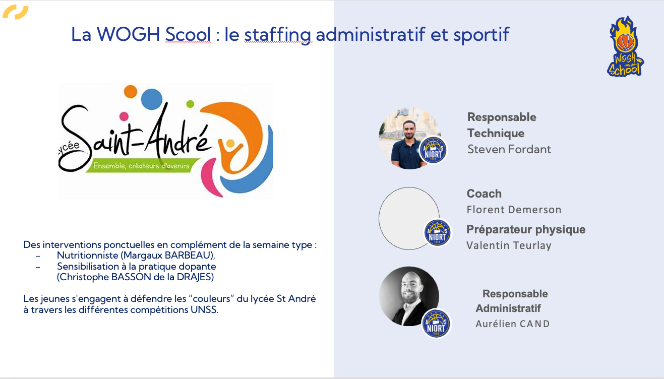 - L’objectif de la collaboration entre le Lycée Saint-André de Niort et l’AS Niort Basket est d’aménager un emploi du temps et de dégager des créneaux pour permettre la pratique du basket avec la “WOGH SCHOOL” permettant ainsi aux élèves de concilier réussite scolaire et développement sportif au travers de leur passion : le basket.